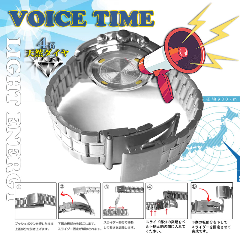 ●ボイスソーラー電波腕時計は、電波受信機能を搭載したアナログ表示ボイスウォッチです。