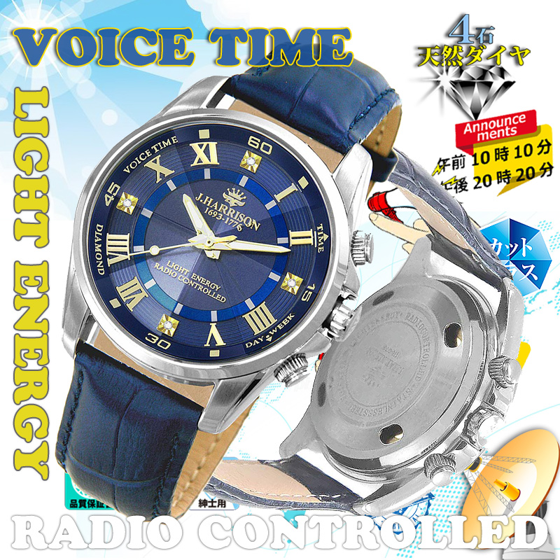 J.H-078NV革・4石天然ダイヤモンド付・ボイスソーラー光発電電波時計