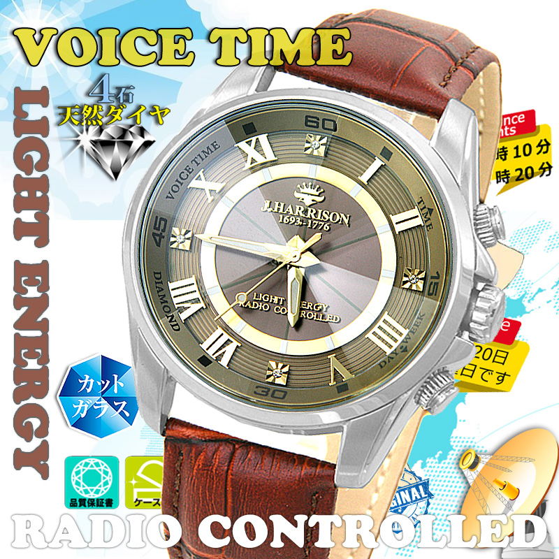 J.H-078GD革・4石天然ダイヤモンド付・ボイスソーラー光発電電波時計
